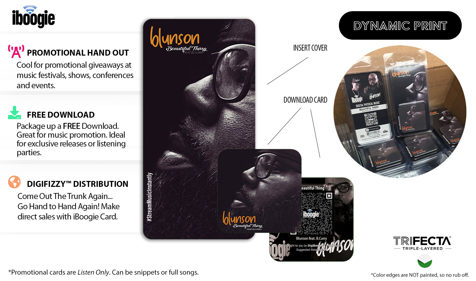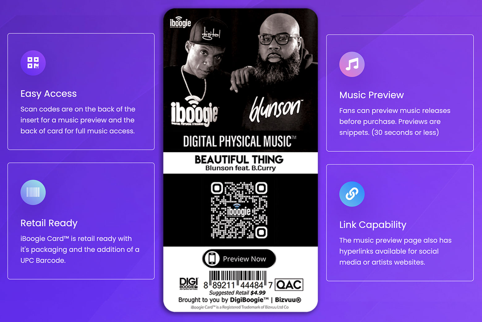 Are you looking for an option for Physical Music Sales... Look No Further... iBoogie's The Solution! The iBoogie Card™ is a Quick Access Card (QAC™) medium for digital music downloads. It can be used for hand to hand sales, promo or retail sales. iBoogie Card™ is made for smartphone use via aux. connections or Bluetooth devices through a Scan, Connect, Listen process.